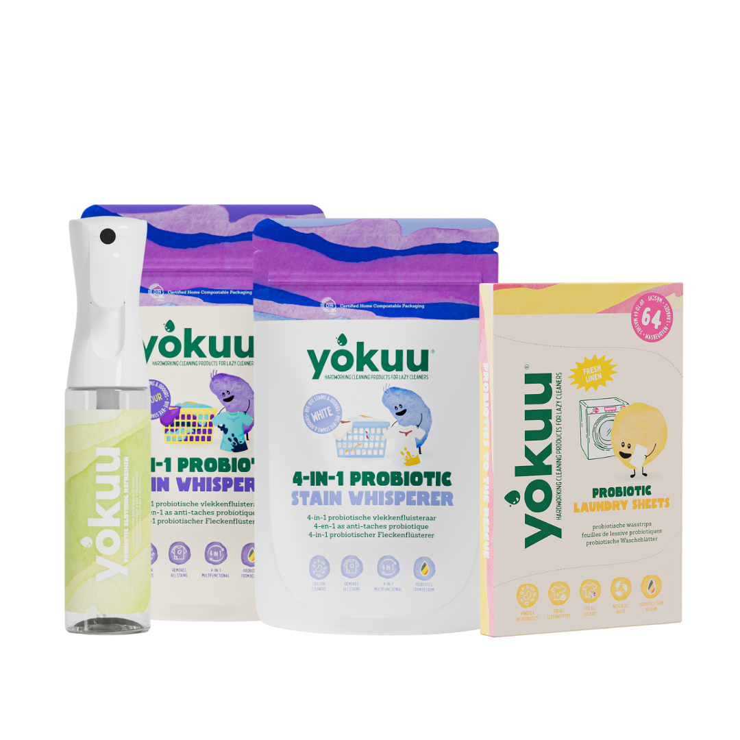 Der Fleckenentferner und die Waschtücher von YOKUU verwenden Probiotika und Enzyme, um Flecken, Schweiß und Gerüche tief in den Fasern zu lösen. Die guten Bakterien reinigen bis zu 7 Tage lang, auch nach dem Waschen.