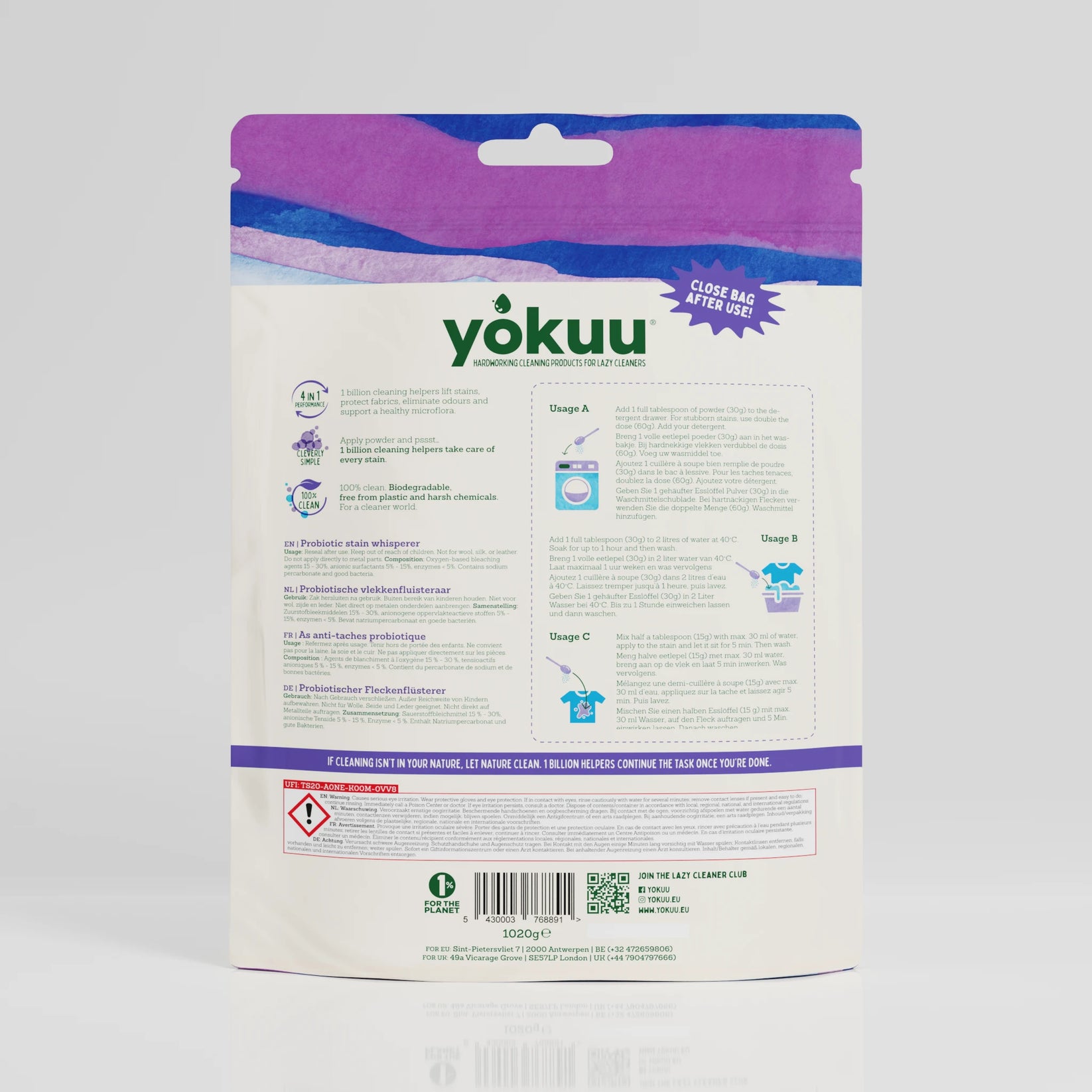 Der Fleckenflüsterer von YOKUU verwendet eine clevere Mischung aus Enzymen und einer Milliarde mikroskopisch kleiner Reinigungshelfer – auch Probiotika genannt –, um sichtbare Flecken und tiefsitzende Gerüche zu entfernen. Er arbeitet bei niedrigen Temperaturen und reinigt auch nach dem Waschgang weiter. So entsteht eine gesunde Mikroflora in Ihrer Waschmaschine und auf Ihrer Kleidung.